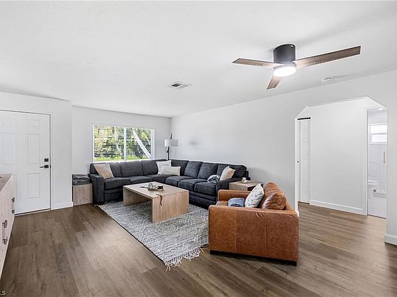 Newly remodeled 3 bed, 2 bath home on a quiet cul-de-sac with a rare bonus 1000 sq ft garage/workshop in the back, offering endless possibilities! The tropical landscaping, freshly painted exterior, and brand-new garage door set the tone for the stunning updates within. The modern charm of this home's interior captivates the senses, from the new luxury vinyl plank flooring throughout and new windows and doors to the freshly painted walls and new designer light fixtures. The gourmet kitchen offers brand-new white shaker cabinets, granite countertops, stainless steel appliances, elegant tray ceiling detail, and additional seating at the peninsula. The bathrooms have been fully renovated, boasting chic fixtures and modern vanities, creating a spa-like retreat within your own home. Additional features include two separate living rooms and a formal dining area. French doors lead to the large screened lanai overlooking your fenced backyard. Let your creativity flow and turn the outdoor space into the ultimate resort destination with a pool and spa. Enjoy the convenience of being within walking distance to the dog park, easy access to I-75, SWFL International Airport, and minutes to fine dining, shopping, entertainment, and white-sand Gulf beaches. Embrace the SW Florida lifestyle in this immaculate, fully updated home – your slice of paradise awaits!
