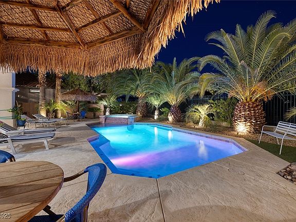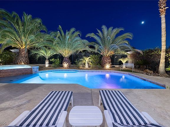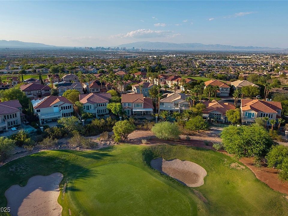 Introducing Villa Serenità, an elegant retreat in the prestigious guard-gated community of Renaissance at Seven Hills. Perfectly set on the Rio Secco Golf Course w/sweeping views of the second green, rolling fairways, & dramatic mountain backdrops, this home blends timeless Mediterranean charm w/modern luxury. Inside, enjoy rich wood flooring, plantation shutters, custom cabinetry, crown molding, & a spacious entertainment built-in. The gourmet kitchen delights w/granite countertops & Viking appliances—including gas cooktop, double ovens, refrigerator, & dishwasher. The resort-style backyard is an entertainer’s paradise, featuring lush landscaping, swaying palms, & two palapas surrounding the sparkling pool, spa, & built-in BBQ. Ideal for hosting family & friends, the setting captures unforgettable sunsets & panoramic golf vistas. Versatile den/office w/glass double doors. Game room/bar/sink/refrigerator/speakers, & full bath—easily converted into/5th bedroom. Immaculate inside & out.