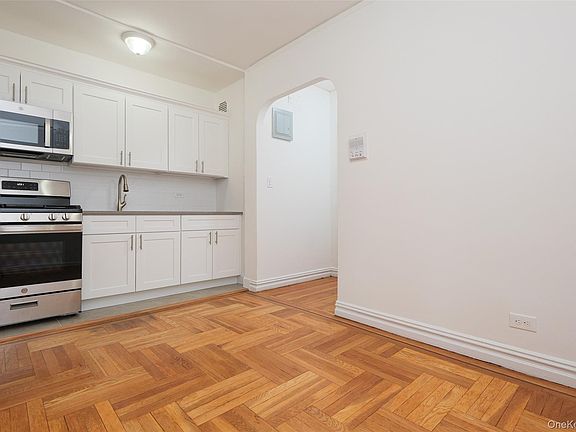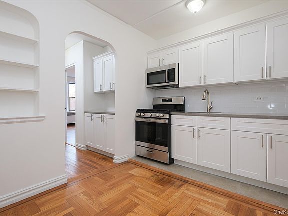 2685 CRESTON AVE #5-E, BRONX, NY 10468 - KINGSBRIDGE HGTS SPONSOR UNIT (No Board Approval) 615 s/f (1) BED w/ Entry, Dining Foyer w/ renovated Pullman Kitchen, white Shaker style cabinets & stainless appliances; Sunken east-facing Living Room w/ original basket-weave parquet floor, plaster arches; Hall/Dressing Area w/ white Shaker style cabinets, east (front-facing) Bedroom, windowed Bath; w/ abundant eastern sunlight. Art-Moderne elevator building attributed to architect H. Herbert Lilien, ca. 1940. Exceptionally managed, meticulously maintained 6 story, 73 unit non-D/M building w/ Main Lobby featureing a dramatic Machine Age terrazzo floor,'Rosso' marble walls, plaster moldings & niches and a new elevator cab w/ original embossed elevator door. Actual $799.08 Maint. (as of 07/01/2025) includes H & H/W. Resident supt. & on-site laundry. Convenient to Kingsbridge Road & Grand Concourse shopping, MTA XP/local buses, IND B/D/IRT #4 Subway Kingsbridge Road station. EZ access to midtown NYC in 30 minutes. Capture these stylish digs for $35K cash down. No Pets/No Investors, please.