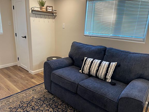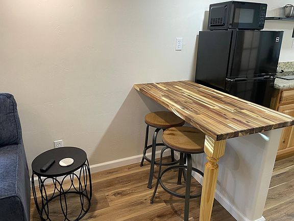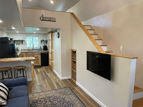 Gorgeous new Tiny Palace in Granite Dells by Granite Creek and bouldering rocks! The space is small, but it is nice and it has a luxury queen bed and a little extra media space upstairs in the loft. The kitchen is fully built out with a microwave, fridge with freezer, dishwasher, cooktop and really nice convection/toaster oven, a Keurig coffee maker and seating at the butcher block bar for two. The countertops are lovely granite and the base cabinets are hickory. The flooring is made of dense material designed to withstand anything and the tile lined shower has a handheld and rainfall shower heads. The space is heated and cooled by a very quiet split unit and the place has dense foam Insulation throughout to keep it warm in winter and cool in summer! This home is turn-key furnished, and the owner pays all utilities including super fast WiFi. There is ample parking, on site laundry room!