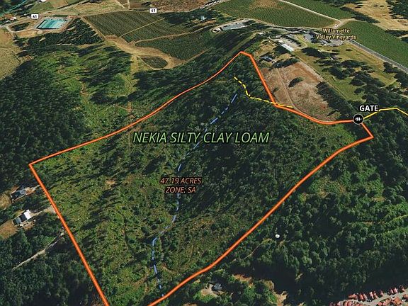 Located adjacent to Willamette Valley Vineyards, this 47-acre parcel has both Eastern and Northern slopes, making it an ideal location for vineyards on East slopes and Christmas tree production on the North slopes. The property has electricity and internet access, and is accessed with a paved driveway and a security gate. It is conveniently situated just ½ mile from Interstate 5 and 2.5 miles from S Salem. Buyer is responsible for due diligence with respect to Marion County SA zoning for potential dwellings.Property with SA zone with high value Nekia soils typically need to show $80k income for two out of 5 years or 2 years consecutively to qualify for a dwelling. Property with SA zone with low-value Nekia soils affected by steep slopes typically need to show $40k income for two out of 5 years or 2 years consecutively to qualify for a dwelling.
