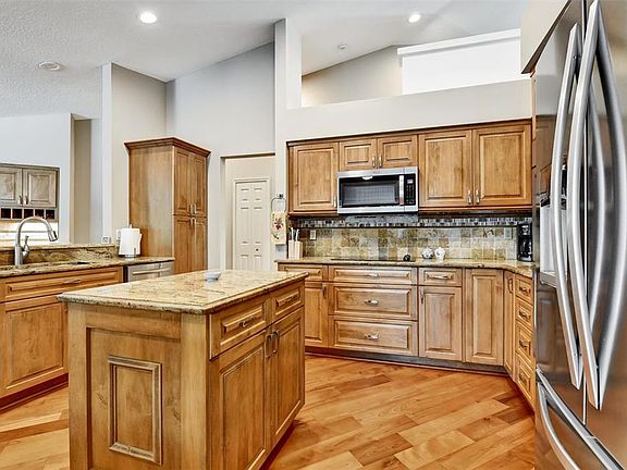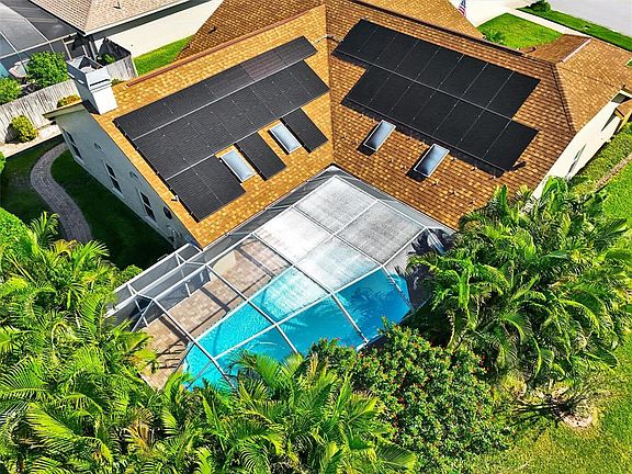 Welcome to an extraordinary 3-bedroom, 2 1/2-bath home in Waterford Crossing in Palm Harbor/Dunedin. This home is brimming with modern luxuries and timeless elegance on a 0.28-acre corner lot. This meticulously upgraded 2,495 square foot home showcases premium improvements completed between 2018-2025, including a whole-house seller-owned solar system (2024; electric bill is only about $40/mo!), new roof (2023), fresh interior and exterior paint (2023), upgraded HVAC ductwork with R-38 attic insulation (2023), and granite countertops with custom wood vanities in all bathrooms (2025). Enter through double doors into a welcoming atmosphere with warm tones, cathedral ceilings, and stunning hardwood flooring throughout. The thoughtful split-bedroom floor plan features a dedicated primary suite on the south side with sliding doors to the pool, two walk-in closets, and a gorgeously remodeled en-suite bathroom enhanced with granite counters and custom wood vanity. The gourmet kitchen boasts granite countertops, breakfast bar, solid-wood cabinetry, stainless steel appliances, including built-in double oven, cooktop, built-in microwave, and center island, flowing seamlessly into a large living room with wood-burning brick fireplace and cathedral ceilings. Two guest bedrooms and a guest bathroom with granite counters and custom wood vanity provide comfortable accommodations. French doors from kitchen and dining room open to an exquisite lanai featuring gorgeous paver deck, large in-ground screened pool, temperature-controlled half bath, outdoor shower, and covered lounge space. Professional landscaping includes paver walkway extending to the pool area. Premium infrastructure includes impact-resistant windows (2014), HVAC system (2019) with UV light purification (2025), new water heater (2018), Tesla EV charging station (2023), elegant ceiling fans (2024), new window treatments (2023), upgraded door hardware (2023), reclaimed water irrigation system overhaul (2025), and accessibility grab bars. Located just 1.5 miles from Dunedin Causeway, Honeymoon Island Marina, Pinellas Trail, and area restaurants. Bike or walk the Pinellas Trail to downtown Dunedin for local shops and entertainment. Call today for your private tour - in-person or live virtual tour available upon request!