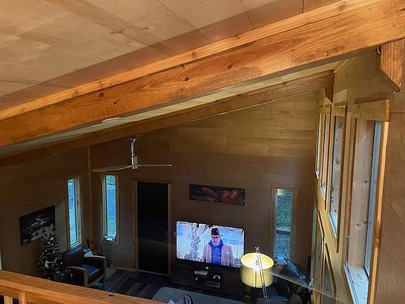 with narrow windows facing the shaded work shed and fire pit to the south ensures occupants have the best of all worlds. Two-thirds of the interior are occupied by a massive great room with an open kitchen layout, beamed ceilings, and is overlooked by the upstairs loft bedroom. The loft extends the width of the structure and has room for sleeping, storage, and a small office. Beneath it is the full restroom and an additional, smaller sleeping area. The floorplan was laid out in such a manner that an additional Master Suite could easily be added to the back side at a later