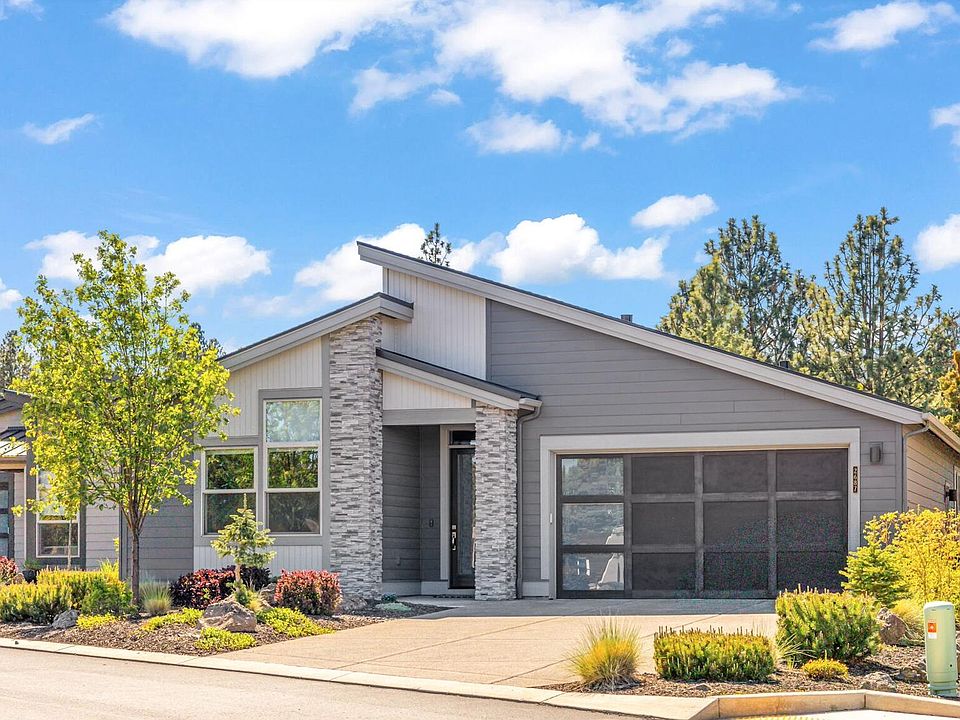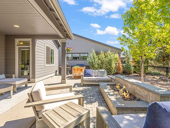 Step into elevated living in this stylish single-level home in The Pointe at River's Edge Village, a gated Bend community with private Deschutes River and trail access. Just minutes from downtown, this home impresses with 10-foot ceilings, rich hardwood floors, and a flowing open layout. With 3 bedrooms plus a dedicated office, it blends function with comfort. Out back, unwind with sweeping golf course views, a spacious covered patio, stone fire pit, and irrigated garden bed—all in a fenced, private setting. The oversized 2-car garage adds space for a workshop or gear. Ideally located near an organic grocer, and just a quick hop to Costco, Trader Joe's, Newport Ave, Galveston Corridor, and NWX—with easy access to all areas of town. Sophisticated yet relaxed, this is Bend living at its best.