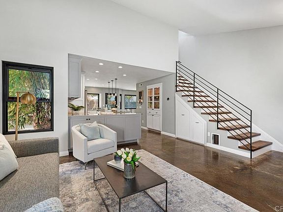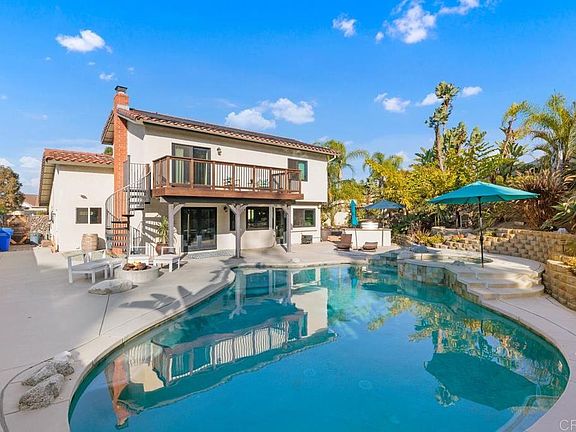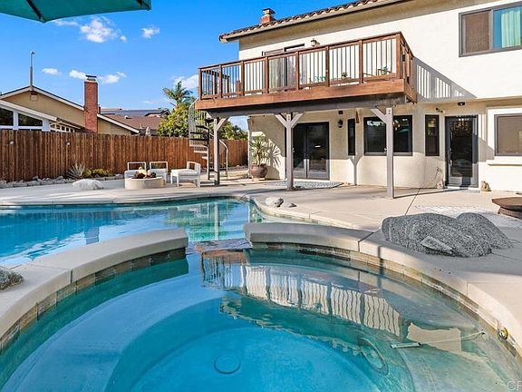 Welcome to this beautifully updated pool home on a private cul-de-sac with Ocean Views! This 3 bedroom, 3 bath solar energy home includes polished concrete flooring downstairs and engineered wood flooring upstairs, fully updated kitchen and bathrooms, recessed lighting throughout, a custom hickory staircase and new energy efficient fiberglass windows and doors. The large master bedroom with wall mounted fireplace has a custom walk-in closet with built in cabinetry. Just off the master bedroom you’ll find ocean views from the newly built cedar wood deck that overlooks the pool. The backyard saltwater pool and elevated spa area are an entertainers dream with a built-in 8 burner gas grill, fire pit, lounge area and a spiral staircase that leads to the upper deck. The large side-yard can accommodate a boat or an RV and the whole property has drought resistant landscaping with an automated drip irrigation system. Only two blocks from the dog park and the Hidden Canyon Community Park. Close to the beach, mall, shopping and the 78 and 5 freeways. No HOA!