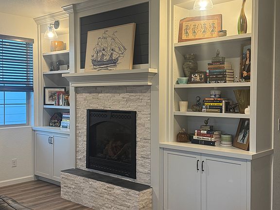 Fully fenced backyardModern cabinetryUpgraded countertopsBuilt-in bookcaseCozy gas fireplace