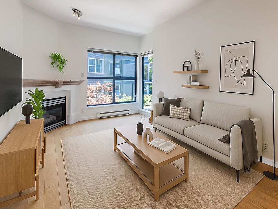 Gorgeous 1 Bedroom and Den in the TREO at Arbutus Walk opposite Connaught Park, steps to Kitsilano Community Centre, Broadway shops and the future Arbutus skytrain. The east facing unit soaks up the morning sun and gets warmed up early in winter days, and on hot days the sun stops heating up the unit in the afternoon. The spacious suite features 8'10" ceilings, oak hardwood floor, mirror closet doors, gas range, gas fireplace with art deco mantel, and a balcony overlooking the beautifully landscaped courtyard. Excellent amenities include a well-equipped gym, nice social room, bike room, underground visitors' parking and car wash bay. Pet friendly. Don't miss this gem! OPEN HOUSE: 1:30-2:30pm Sat 10/4 and 3-4pm Sun 10/5.