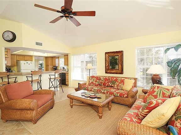 Amazing southern exposure lake views in this carriage home in Bonita Bay. This 3 bedroom, 2 bath 2nd floor unit, features a fully equipped kitchen open to living area with large screen TV and access to the dining room which will seat 6 people. The primary suite with king bed, TV, walk-in closet, and ensuite bathroom with separate tub and shower. The guest bedrooms consist of a queen bed and the other has 2 twin beds. The enclosed lanai can be opened as a screen porch or closed as an extended living area. There is open air balcony off lanai. A detached 2 car garage with bicycles for tenant use. Neighborhood grill just steps away from the unit. This unit comes with a laundry room, wifi and cable. Enjoy miles of walking/bike paths or take the shuttle to the private park on Bonita Beach. Recreational areas include Spring Creek, with canoe and kayak launches. Riverwalk Park offers lighted tennis courts, fishing piers, and a playground. Estero Park offers a pavilion picnic area, butterfly park and boardwalk to Estero Bay. Beach Club can be accessed by tram provided by Bonita Bay Beach Club and provides lounge chairs, and gazebo with picnic tables.