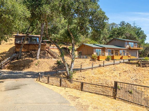 Nestled on a hillside in Cloverdale's desirable Palomino Lakes neighborhood, this 2 ac parcel offers sweeping vistas across the Alexander Valley. This secluded 3-Bed 2-Bath main home plus separate cottage blends tranquility, modern updates and Wine Country charm. The 1,546 sf main residence is designed for seamless indoor-outdoor living. An expansive front veranda is an ideal perch to watch soaring hawks & vibrant west-facing sunsets. Open-concept living room with a wall of glass & laminate flooring flows into a stainless kitchen w rich wood countertops. With 2 bedrooms and a full bath on the main level, the spacious primary suite upstairs enjoys an updated bath with soaking tub & private viewing deck. 2-car garage + plenty of guest parking for group getaways & gatherings. Don't miss the potential 2nd building site or outrageous glamping spot on the lower portion of the lot also w vast views. Upgrades incl new carpeting, fresh interior paint, new metal roof & ductless mini-split heat pump system. Detached non-conforming cottage w vaulted ceilings, laminate floors and 3rd full bath offering ADU potential with flexible living options for guests, creative pursuits, or home office. Mins from downtown Cloverdale & world-class wineries, this rare retreat will take your breath away!