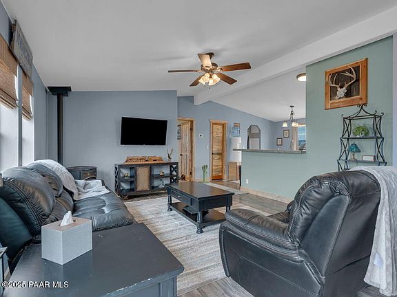 This stunning remodeled home features three bedrooms and two bathrooms, with a roof that's only 2 years old. The expansive property spans four acres and includes a large metal barn, a custom-built chicken coop, and a fenced area with a charming water feature. The cozy living space offers the warmth of a pellet stove in the living room, which is complemented by wood-look flooring and custom wood doors and baseboards. Outdoor amenities include a fenced dog run conveniently located off the back patio, while young trees have been planted to enhance the property's beauty as they mature. The water storage system includes two 2,500-gallon tanks. The property also boasts a detached 30x40 three-car garage with a remote opener accessible from inside the house. Additionally, the open-concept kit makes this home easy to show and ready to sell, with many furnishings available to be included in the sale.