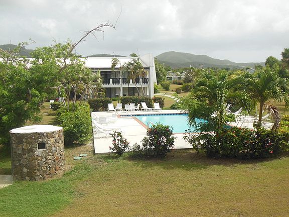 This condo resides in a small oasis of only 42 units, overlooking the pool. Boasting high ceilings, spacious bedroom, lovely outdoor gallery, low monthly fees, and in move in condition. Great starter home or fantastic rental potential. Property includes automatic generator, solar panels for hot water heater, gated entry, and easy breezy laundry room. New split AC in the bedroom, lots of storage, close to beaches and Frederiksted town. This is an all around favorite.