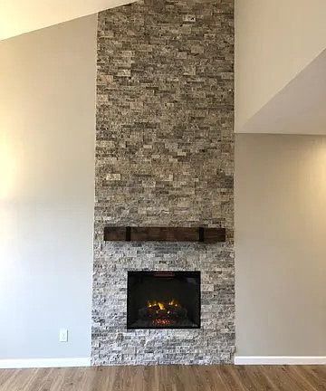 The living room has vaulted ceilings and a cozy electric fireplace with a Travertine stone surround and air conditioning.