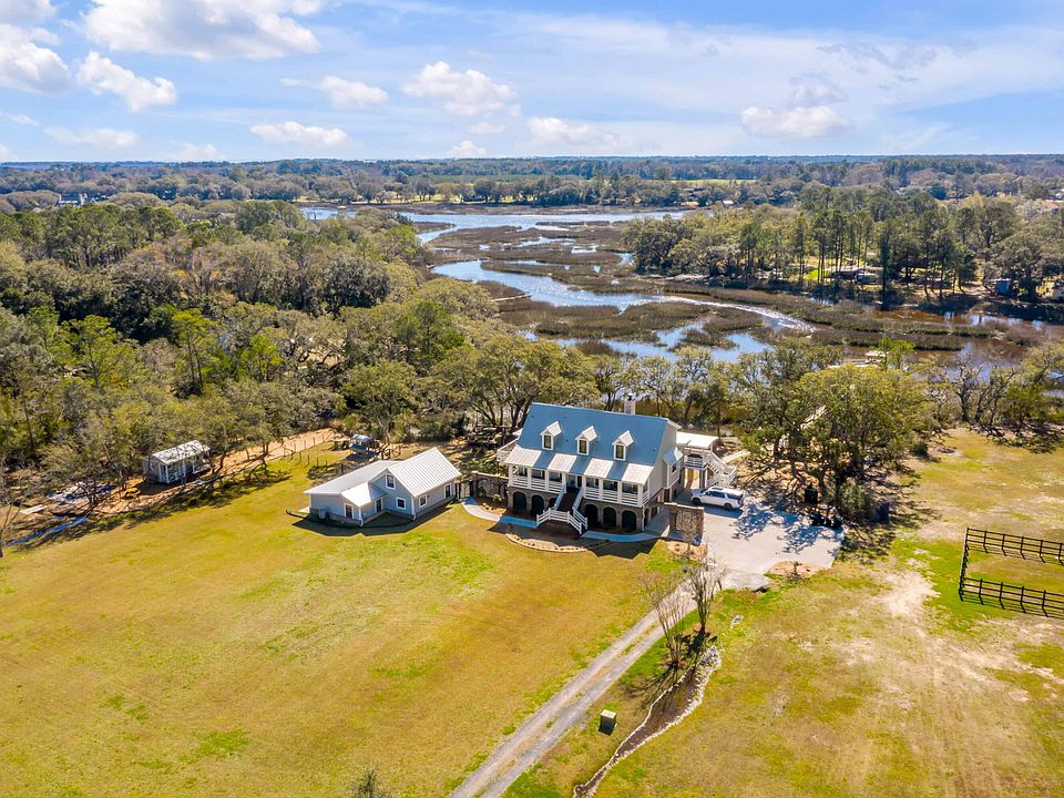 At the end of an oak allee sits a stunning Lowcountry mini farm on 9+ acres on Abbapoola Creek. This southern styled waterfront home is 4,858 SF, with 4 bedrooms and 3 1/2 baths, a welcoming full length front and back porch, and a tidal creek dock and boat lift. Upon entering the property you feel as if you have entered your own private oasis. On the drive in you pass the pasture with ponies grazing in the grass, a serene Lowcountry landscape, and views of oak trees over the water. The full front porch welcomes you in and you immediately feel at home. The interior features a living room with a vaulted ceiling, gas fireplace, custom built reclaimed wood bar and sliding doors that permit endless marsh and creek views.The doors lead to the full back porch to embrace the indoor/outdoor living that Charleston is so famous for. The expansive kitchen has a suite of Viking appliances with a gas cooktop, 2 dishwashers, double ovens with a warming drawer, two separate islands, two farmhouse sinks, and a pot filler for the dedicated coffee station. The kitchen cabinets are solid reclaimed wood topped with honed countertops. The kitchen is completed with a gas fireplace, large dining table with ample seating and gorgeous waterfront views. The main floor features the private owners suite with a spacious primary bedroom, his and hers closets, a private wood paneled office or sitting room with access to the covered porch overlooking the water. The primary bathroom boasts a large walk in shower with dual vanities. The main level also features a powder room and laundry room. Continue to the second floor to find 3 additional bedrooms and 2 bathrooms. One bedroom could be used as a second primary suite with a ensuite bathroom, walk in closet, and views of the creek. The lower level is configured for entertainment with a large living space, kitchen, bar area, full bathroom, ample storage areas, and a two car garage. This property has a beautiful and warm 1,093 SF guest house with 2 bedrooms, 1 ½ baths, kitchen and deck with views of the creek and grand oaks. The outdoors is a low country paradise and what makes this property special! It has 9 high acres, dock with a floater, boat lift, private boat ramp, fenced pastures for horses, chicken coop, barn and separate garden house. The outdoor living areas are the perfect place to bring friends and family together. This property is comprised of two parcels and affords the opportunity to add a second dock or a pool and pool house. 2690 Cotton Gin is a Lowcountry retreat which offers a private setting and allows for outdoor activities like skeet shooting, oyster roasts, fishing, crabbing, horseback riding all close to shopping, and dining. Only a short drive to Freshfields, the Johns Island private airport and Downtown Charleston.