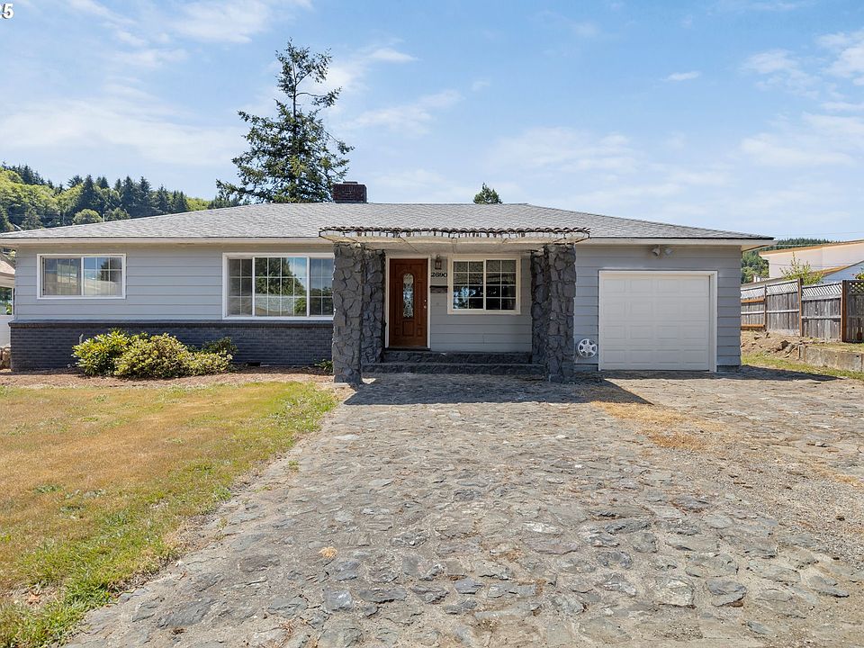 Step inside 2690 Gardens Ave, Reedsport, OR 97467, and discover a welcoming home with charming curb appeal. Enjoy the beautiful covered porch featuring sturdy rock-covered beams and elegant brick exterior accents. This 3-bedroom, 2-bathroom residence includes an office and offers double-pane vinyl windows and durable laminate flooring throughout. Relax in the living room with a cozy fireplace set against a stylish accent wall, or unwind in the family room with its own electric fireplace. The kitchen is well-appointed with a refrigerator, range, microwave, tile flooring, and ample countertop space for all your cooking needs. Each spacious bedroom has ceiling fans for comfort, and the laundry room is equipped with a sink, washer, dryer, cabinetry, and extra countertop space for folding. Additional features include an attached one-car garage, a fenced backyard, a concrete covered patio, and a detached workshop. This home is ready for you to make it your own—don’t miss out on this fantastic opportunity!