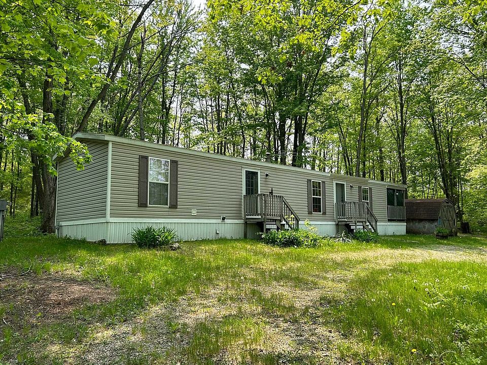 Secluded & private location comes with this really nice 2000 mobile home with 2 bedrooms, 1 bath and a nice covered porch. Beautiful wooded setting with circle drive and also a trail that goes to the road at the back. Perfect location for accessing state land/trails and has a nice area with the fire pit for those relaxing nights around the fire with family and friends. Kitchen has oak cabinets and a bar area for extra seating. Bedrooms are good size and have nice closets so plenty of storage. Includes range, refrigerator, washer and dryer. Move in and start enjoying this amazing wooded setting today!