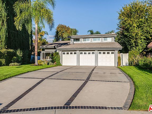 California Contemporary in celebrated Calabasas, one of the most desirable areas to live in L.A. County. On a quiet family-friendly cul-de-sac, this 2-story blends a Traditional exterior with a modern layout. Filled with natural light, the step-up living room has a vaulted beam ceiling and hardwood floors. French doors in the formal dining room reveal an outdoor lounge, perfect to enjoy sunsets. The great room provides fireside seating and keeps the cook in the mix with an open eat-in kitchen. Upstairs bonus loft for reading nook or gaming zone. Sweet dreams in the spacious master suite featuring a vaulted ceiling, lovely brick fireplace with a beautiful mantel, hardwood floor, walk-in closet and en suite for two. Relax in the private outdoor oasis with pool, spa, cov'd patio, built-in BBQ and fire pit. Lushly landscaped front/back. Enjoy a great lifestyle with local events, hiking and walking trails, parks, prime shopping and dining, rustic mtn, views, and impressive school district.