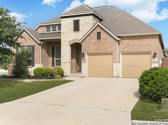 OUTDOOR KITCHEN. 3 CAR GARAGE. CORNER HOMESITE. HEALTHY HOME W/ ADVANCED ALLERGEN COMPONENTS. Imagine Living the Life...Designed with a relaxed traditional style. This amazing residence is overflowing with the finest of everything. Situated on an oversized corner homesite located within the gated neighborhood of Sablechase. Don't be fooled by the 2-car presence. Your 3-car tandem awaits behind that bay door. Enter your home through a beautiful, custom crafted 8ft front door boasting gorgeous hardwood look tile floors, stone accents and crown molding. Enjoy the elegantly styled kitchen that offers gas cooking, stainless appliances and solid maple wood cabinets positioned with an open concept and island seating. The living space features a fireplace that is perfect for this time of the year to cozy up next to for the upcoming cool winter nights. The spacious master retreat offers separate vanities, walk-in closet & separate garden tub with oversized shower. A covered patio overlooks a generously sized backyard with a custom designed outdoor kitchen with pellet smoker, propane grill, integrated sink and gas pizza oven!!! Coveted BISD. Easy access to IH10 and Medical Center. Close proximity to The Rim and La Cantera. Oh, did I mention the brand-new Lemon Creek development with an HEB and 117 acres of shopping, retail and restaurants less than 3 miles away!!! No city taxes and Resort style amenities to enjoy Tennis and Basketball to name a couple.