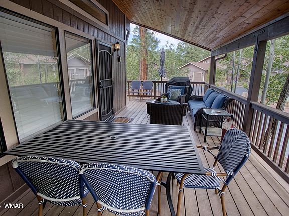 Welcome to Mountain Pines Estates, the only townhome community in Pinetop with exclusive access to the Pinetop Lakes Recreation Center. This beautifully remodeled 3 bedroom, 3 bath townhome is nestled in a quiet cul-de-sac and offered fully furnished with high-quality furnishings (minus a few personal items). Step inside to soaring ceilings, fresh interior paint, and an open-concept floor plan that blends style and function. The spacious living room features new luxury vinyl plank flooring, a cozy stone-accented gas fireplace, and abundant natural light from large windows. The kitchen has been thoughtfully updated with granite countertops, stainless steel appliances, modern cabinetry, and a breakfast bar that flows seamlessly into the dining area. The home offers two primary suites one on the main level and another upstairs both with upgraded bathrooms. A third guest bedroom and bathroom provide space for family and friends. Enjoy outdoor living at its best with multiple entertaining areas, including an oversized covered side porch (approx. 24' x 10') finished in tongue-and-groove knotty pine ceilings, plus a large private back deck off the main-level primary bedroom.