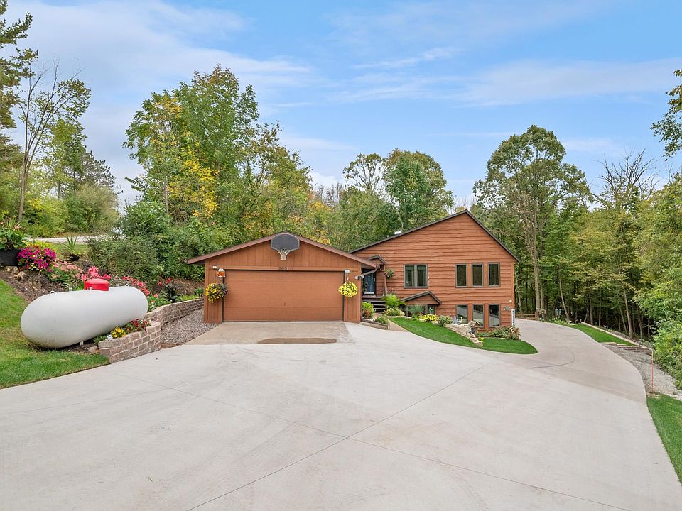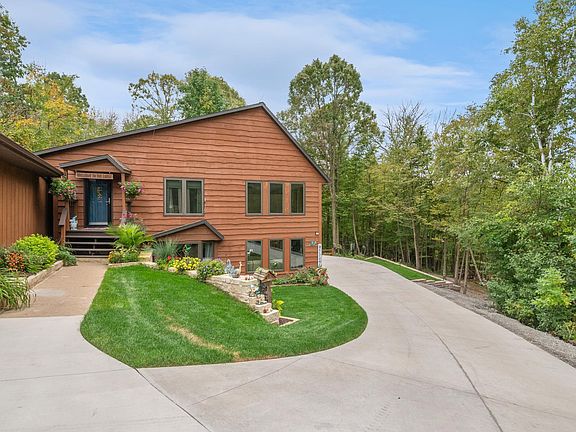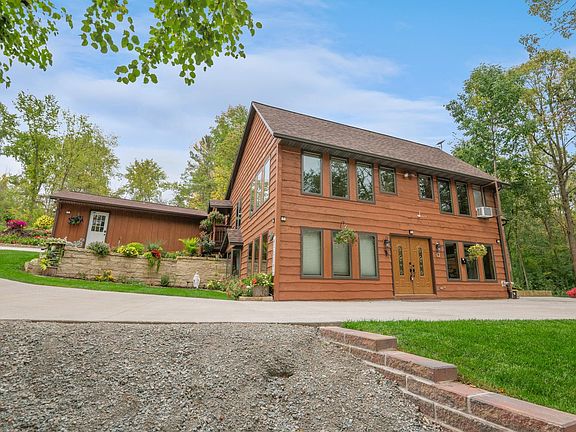 Welcome to your secluded oasis just minutes from city convenience! This striking home sits on almost 5.5 acres! Generously sized with over 3,000sqft with features you will love. High ceiling great room that opens to patio access. Generous bedrooms on the lower and upper floors. Wood burning stove and wood burning fireplace! Ample natural lighting with large windows flood the home with warmth. Two of the bedrooms have bathroom access when the primary having an ensuite and double closet. Attached garage and detached garage on property! Newer retaining wall and an adorable fire-pit for enjoying the wooded acreage!