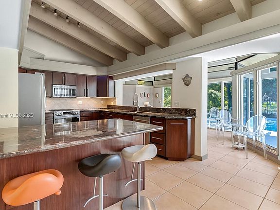 Experience serenity at the edge of the Everglades in this mid-century modern masterpiece. Designed by renowned architect Dan Duckham, a student of Frank Lloyd Wright, this organic home blends wood, coral rock, and expansive glass to bring the outdoors inside. The house features floor-to-ceiling windows and doors along the lakefront, offering stunning views of a fishpond, lush foliage, and tropical fruit trees like key limes and Meyer lemons. Inside, a coral rock fireplace connects the living and family rooms. This 5-bed, 3-bath home boasts recent updates including a new roof, pool resurfacing, impact windows, and modern comforts, making it a unique tropical sanctuary. Some kitchen walls were recolored using AI technology.