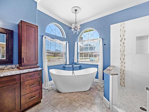 The primary suite is a true retreat with two walk-in closets, a tray ceiling detail, and a spa-inspired bathroom boasting a large soaking tub, a newly tiled shower and surround, and granite countertops.