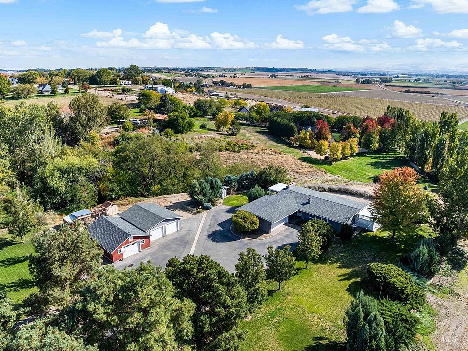 Don’t miss this rare opportunity to own a beautifully maintained home with breathtaking views from nearly every room. The spacious living room welcomes you with large windows that frame views of the Owyhee Mountains. The kitchen features ample cabinet space, built-in spice racks, pantry, solid-surface counters, gas cooktop, and built-in oven/microwave. A dual-sided fireplace connects the kitchen/dining area to the east-facing patio—perfect for entertaining or quiet mornings. The main-level owner's suite offers his & hers closets, a private west-facing patio, and a luxurious ensuite with jacuzzi tub and walk-in shower. The office features glass doors and inspiring views. The daylight walkout basement includes a full kitchenette, living space, 3 large bedrooms, Jack & Jill bath, storage, and mechanical room—ideal for guests or multi-generational living. Outside, enjoy a 33’x22’ converted barn/shop with power, an attached 2-car garage with drive-through doors, plus a detached 2-car garage with RV 220 hookup and small shop.