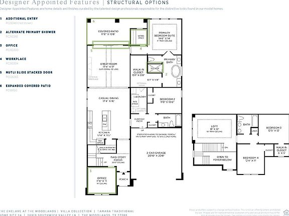 The lovely Tamara Traditional plan features a covered front entry that leads into a two-story foyer flanked by a convenient home office. The gourmet kitchen features a center island, ample cabinet and counter space, and a large walk-in pantry. The casual dining area creates a seamless transition into the great room with fireplace. Multi-slide doors open to the covered patio, expanding your entertaining space to the outdoors. The private guest bedroom off the kitchen is ideal for overnight company. A main-floor primary suite includes a tray ceiling and elegant primary bath with dual vanities separated by a relaxing tub. A separate shower and walk-in closet make the room complete. Upstairs welcomes you with a generous loft area and two spacious bedrooms with a shared hall bath. Located in a lush community with tons of bike and walking trails. Disclaimer: Photos are images only and should not be relied upon to confirm applicable features.