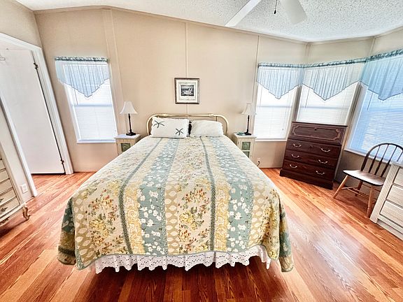 Welcome to Arcadia Village! A beautiful luxury 55+ community. ONE YEAR OF FREE GOLF WITH THE PURCHASE OF THIS HOME! This immaculate, furnished 2-bedroom, 2-bathroom home features an open-concept design and is ideally located across the street from the Cantina clubhouse and pool. Situated on a desirable perimeter lot, it offers a serene backyard setting with trees and an open field. The home boasts vinyl flooring throughout, a spacious master suite, and a comfortable guest bedroom. An enclosed rear lanai with glass windows and screens provides the perfect space to enjoy the beautiful nature views while adding several hundred additional square feet of living space. Storm shutters are included for all windows, along with all appliances and a washer/dryer. Additional features include a double carport and a shingled roof installed in 2023. Monthly lot rent includes city water, sewer, trash pickup, lawn mowing, and property taxes. Residents enjoy access to two heated pools, tennis, pickleball, shuffleboard, fishing, and a clubhouse with card rooms, craft rooms, billiards, exercise rooms, and more. There is also resident RV and boat storage, plus two professionally managed 9-hole executive golf courses. See video tour here: https://youtu.be/UI1UUORR8aM