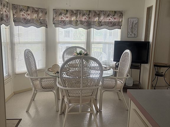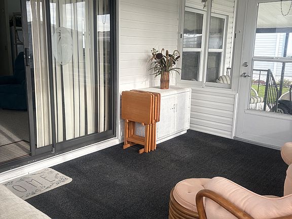 Charming and well-maintained furnished two-bedroom, two-bath home featuring a cozy front lanai enclosed with glass windows and screens, adding extra living space. The spacious master suite includes a huge walk-in closet, while the second bedroom and bath are nicely sized for guests. Interior highlights include a mix of Berber carpet, vinyl flooring and ceiling fans throughout. Recent updates include full replumbing in 2024, a durable rubber slate roof, a new water heater, and a convenient washer and dryer inside. There is also a transferrable warranty on the roof. This won't last for long, schedule a visit today!