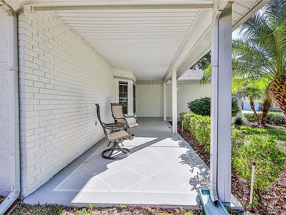 Welcome to this charming 2-bedroom, 2-bathroom home with a 2-car garage, set on a beautifully landscaped lot featuring mature trees and graceful Robellini palms. The inviting front porch is perfect for greeting neighbors, while the private screened sunroom in the back offers a peaceful retreat overlooking the yard. Step inside to a bright and open living room and dining room combination that flows seamlessly into the sunroom. The split floor plan provides comfort and privacy, with the spacious primary suite featuring a ceiling fan, large walk-in closet, built-in shelving, and an updated ensuite bathroom complete with a newer vanity with marble top, step-in shower, and new toilet. The kitchen is thoughtfully designed with stainless steel appliances, a range hood, pantry, panoramic windows, and a large double sink. A convenient pass-through window opens to the sunroom, making entertaining a breeze. Just off the kitchen, the family room offers extra living space with a ceiling fan and a dry bar—perfect for relaxing or hosting guests. The guest bedroom features a new ceiling fan and sits just across the hall from the full guest bathroom with an updated toilet. Throughout the home, you'll find beautiful luxury vinyl plank flooring and double-pane windows that tilt in for easy cleaning. The inside laundry room includes two closets, cabinets for storage, and a new utility sink—plus the washer and dryer stay! The 2-car garage offers additional storage with a built-in workbench and pull-down attic stairs. Roof 2022. HVAC 2015. Windows 2020. Remediated settlement with all documents fully insurable and financeable. Timber Pines is an award winning, guard-gated, 55+, deed-restricted community offering a resort-style lifestyle: three 18-hole golf courses, a 9-hole pitch & putt, tennis, 12 pickleball courts, two community swimming pools, country club restaurant and bar, fitness center, billiards, performing arts, and over 100 social clubs and activities. With its thoughtful floor plan, abundant natural light, and key system updates, this home is move-in ready. Don't miss your chance to make it yours!