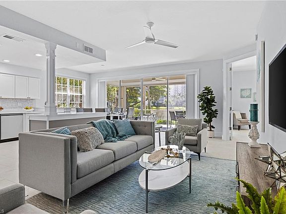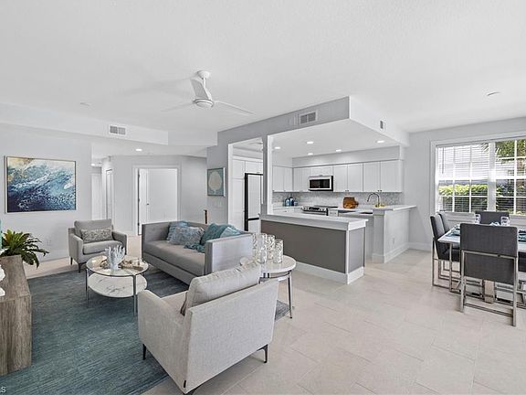 V10691. Escape to a world of exquisite luxury and seaside serenity with this meticulously renovated coach home, nestled within the highly sought-after Bonita Bay community. The flawless renovation and attention to detail showcased throughout this extraordinary 2-beds, 2-baths condo with a den, offers an irresistible blend of comfort, and coastal charm. This unit will captivate you with its amazing view, which will welcome you from the moment you step through the door. The open concept kitchen boasts sleek quartz countertops, custom cabinets, and top-of-the-line appliances, including a stylishly integrated wine cooler beneath the kitchen island, providing both functionality and flair. The master room will offer a peaceful vista of the lake and private access to the Lanai. The master suite bath is the perfect place for relaxation and indulgence, featuring a magnificent soaking tub, dual vanities, and a custom walk-in closet. This well-designed floor plan offers total separation between the guest room, den, and master suite, ensuring privacy and comfort. Bonita Bay offers unparalleled amenities. private beach club, kayaks, canoes, pickleball, and tennis, marina.