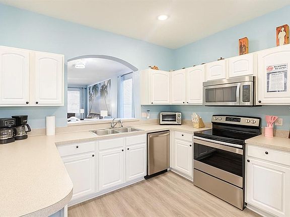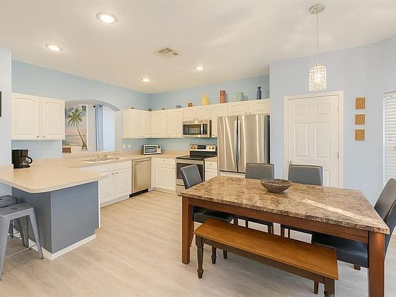 This Stunning, fully renovated, turnkey 6-bedroom, 4-bathroom pool home is located in the highly sought-after resort community of Windsor Hills. From the moment you enter, you're greeted by updated flooring that complements the open-concept layout and spacious interior. The bright and modern formal dining room flows seamlessly into a family room filled with natural light. The stylish kitchen features stainless steel appliances, and a charming breakfast nook, perfect for both entertaining and everyday living. Sliding glass doors open to your private outdoor oasis, complete with a sparkling pool, relaxing hot tub, and an extended covered lanai. In addition, the first floor also includes a convenient bedroom, while the second level offers five additional bedrooms, including two beautifully appointed en-suites. Windsor Hills is a premier, guard-gated community offering five-star amenities, including waterslides, a splash pad, resort-style pool and hot tub, sundry shop, movie theater, arcade, fitness center, playgrounds, and courts for tennis, volleyball, and basketball. Conveniently located approximately 1 mile from Hwy 192, this home provides quick access to great shopping, dining, I-4, and theme parks—making it the perfect primary residence, vacation home, or income-producing short-term rental.