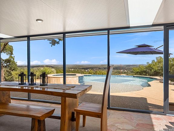 HILL COUNTRY RETREAT WITH PANORAMIC VIEWS, DUAL LIVING SPACES AND TINY HOME -- Perched on a private hilltop with absolutely breathtaking panoramic views, this 3,519 sq. ft. newly renovated stone and stucco duplex offers the perfect blend of privacy, versatility, and timeless Hill Country charm. Situated on 4.95 acres, this one-of-a-kind property is ideal for multigenerational living, guest accommodations, or income potential with two fully independent residences under one roof. UNIT A features two master suites, 2.5 baths, and a private 225 sq. ft. outdoor terrace. UNIT B offers one master suite, two additional bedrooms, 2.5 baths, and its own 225 sq. ft. outdoor terrace. Both residences welcome you with Saltillo-tiled entries that open into expansive living and dining areas, each anchored by a dramatic floor-to-ceiling rock fireplace. At the heart of each home lies a beautifully updated kitchen with custom soft-close cabinetry, high end countertops, designer lighting, and high-end finishes-perfect for everyday living or entertaining in style. Spacious master suites on both sides provide updated spa-inspired baths, private laundry closets, and direct access to sweeping Hill Country views. A screened-in 250 sq. ft. porch connects the two units and overlooks a sparkling pool and hot tub, creating a shared oasis for relaxation, fun, and entertaining. Enjoy quiet mornings, vibrant sunsets, abundant wildlife, and even Fiesta fireworks from the privacy of your own hilltop retreat. Energy efficiency comes built-in with a durable metal roof and 86 ION solar panels (installed in 2019). Adding even more versatility, a fully functional tiny home sits on the property-perfect for guests, extended family, a private office, or an income opportunity. Tucked away at the end of a private road, this residence provides the serenity of country living while being just 15 minutes from Downtown Boerne and Leon Springs, and only 20-30 minutes from San Antonio's modern conveniences. Whether you're gathering family under one roof, welcoming guests, or simply seeking a private Hill Country escape, this retreat offers a rare opportunity to experience Texas living at its finest. Award-winning Boerne School District, voluntary HOA fee of $400 for garbage, and NO city taxes!