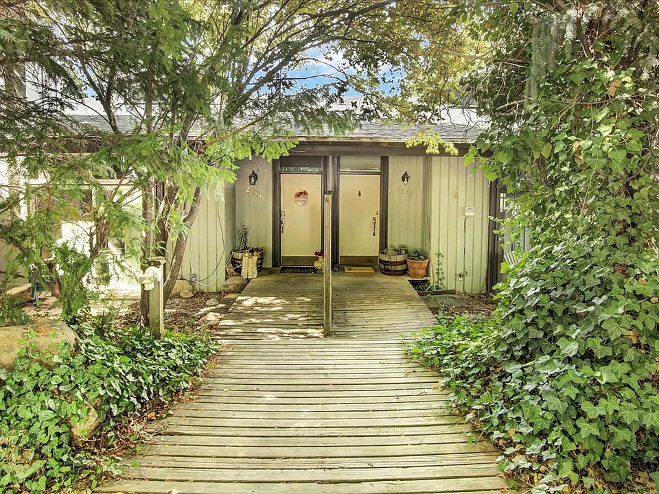 Ample parkingCovered porchLush landscapingSeparate spacious garageWooden accentsWooden walkwayNatural light