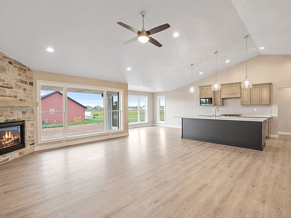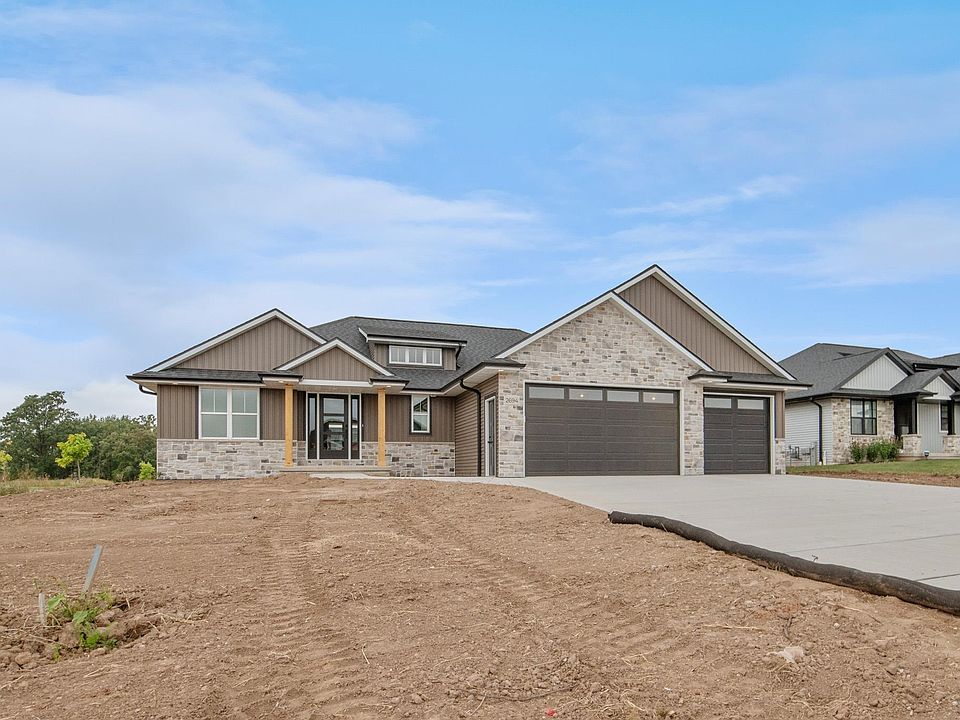 Welcome to the beautifully designed Oakdale Model! Step inside to an open concept layout filled with natural light, highlighted by large windows, a cozy gas fireplace, and a designated dining area that flows seamlessly into the living space. The spacious kitchen boasts high-end finishes including quartz countertops, a sleek tile backsplash, and a generous 6x8 walk-in pantry ideal for storage. Thoughtfully designed with a split-bedroom layout, this home includes a convenient locker system, laundry room, and a half bath with direct access to the oversized 3-stall garage. The luxurious primary suite features custom tile shower and walk-in closet. The lower level is prepped for future expansion with plumbing for a full bath and an egress window. 12x12 composite deck included!