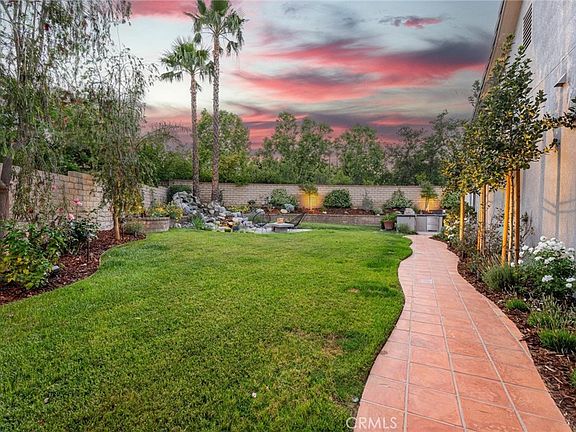 Truly spectacular Valencia Westridge 4 bedroom with downstairs primary bedroom and huge park-like yard! Perfectly located at the end of a cul-de-sac and with no rear neighbors, exceptional privacy. As great as the yard is, the house actually matches it! Stunning kitchen remodel with quartzite counters and huge center island, white shaker custom cabinets, soft closing drawers, Wolf 6-burner stove, Sub Zero refrigerator, walk in pantry...this kitchen has it all! Fresh paint in and out and the home shows like a model. The sellers also reconfigured the access to the yard by removing the window and adding a large double opening French door to really enjoy the space. The lot is definitely pool-size (almost a quarter acre) with full BBQ cook’s station including sink, fridge and burners...it’s as nice to cook outside as in! Big covered patio, tons of grass, gorgeous waterfall/pond feature for ambiance. A truly tranquil setting with plenty of room to entertain. Inside features wood floors, tasteful window treatments and vaulted ceilings for a very open feeling upon entry. This is the popular "lives like a single story" model with the main primary bedroom downstairs with a large walk-in closet and a second "junior" primary upstairs with private bath and walk-in closet. All bedrooms are spacious, and the home has a lot of natural light. The solar system is OWNED and there are no Mello Roos taxes in Westridge. Great HOA offers pools, tennis courts, parks and security all close to 3 of the highest rated schools around. What a home!