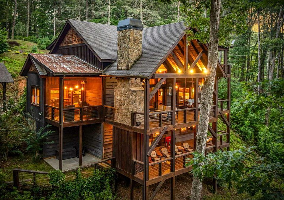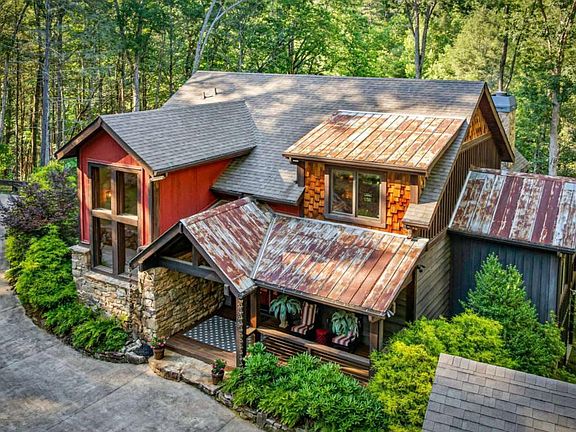 This stunning FULLY FURNISHED Keith Sumner-designed Rustic Craftsman home offers the perfect blend of luxurious mountain living and timeless style, located on the banks of the highly sought-after FIGHTINGTOWN CREEK. Step inside to an open floor plan with soaring cathedral ceilings, rich hardwood and stone flooring throughout, and dramatic stone accent walls. The main level and terrace level living areas feature two striking stacked stone fireplaces, while a third outdoor fireplace on the covered deck invites you to enjoy the serene sounds of the rushing creek year-round. The custom kitchen is a chef's dream with solid wood cabinetry, a spacious island, stainless steel appliances, and sleek stone countertops-perfect for entertaining. This fully furnished home includes three spacious bedrooms and three full bathrooms, along with a half bath on the main level and a half bath on the terrace level. The main-level primary suite boasts private deck access for peaceful mornings in nature. Upper level, a guest bedroom enjoys its own private deck with a large loft area with two bunk beds, while the terrace level offers a queen bunk room, additional bedroom, and a large family room ideal for movie nights or hosting guests. With wood and stone finishes throughout, laundry on the main level, and ample space for family and friends, this property offers a true luxury mountain retreat. All of this is set on a large lot with 225ft of creek frontage and bunk space for extra sleeping capacity. Don't miss the opportunity to own a one-of-a-kind creekfront masterpiece by one of Blue Ridge's most renowned builders.