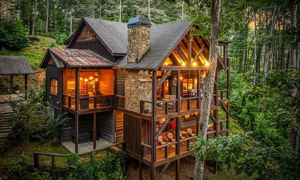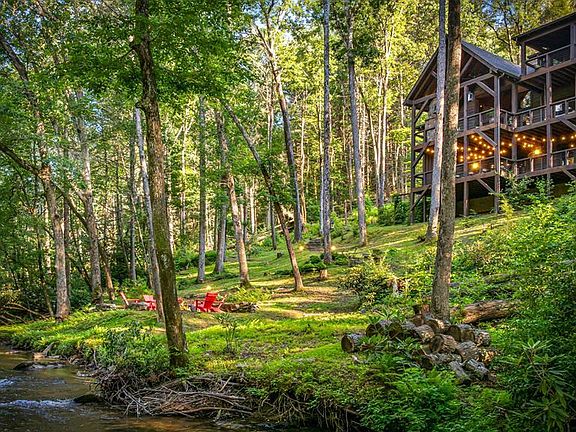 This stunning FULLY FURNISHED Keith Sumner-designed Rustic Craftsman home offers the perfect blend of luxurious mountain living and timeless style, located on the banks of the highly sought-after FIGHTINGTOWN CREEK. Step inside to an open floor plan with soaring cathedral ceilings, rich hardwood and stone flooring throughout, and dramatic stone accent walls. The main level and terrace level living areas feature two striking stacked stone fireplaces, while a third outdoor fireplace on the covered deck invites you to enjoy the serene sounds of the rushing creek year-round. The custom kitchen is a chef's dream with solid wood cabinetry, a spacious island, stainless steel appliances, and sleek stone countertops—perfect for entertaining. This fully furnished home includes three spacious bedrooms and three full bathrooms, along with a half bath on the main level and a half bath on the terrace level. The main-level primary suite boasts private deck access for peaceful mornings in nature. Upper level, a guest bedroom enjoys its own private deck with a large loft area with two bunk beds, while the terrace level offers a queen bunk room, additional bedroom, and a large family room ideal for movie nights or hosting guests. With wood and stone finishes throughout, laundry on the main level, and ample space for family and friends, this property offers a true luxury mountain retreat. All of this is set on a large lot with 225ft of creek frontage and bunk space for extra sleeping capacity. Don't miss the opportunity to own a one-of-a-kind creekfront masterpiece by one of Blue Ridge's most renowned builders.