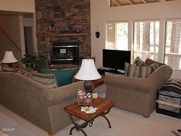 One of the best locations in the subdivision - backs up to the RR Grade property; your views from the deck are fabulous! Excellent floorplan with three bedrooms, three full baths, plus a large loft. Steps from National Forest trails - you can walk or ride right from the property. Includes PL Rec Center privileges. Gently used as a summer retreat, upgrades include vaulted tongue and groove pine ceilings, covered deck, and beautiful rock fireplace with gas log lighter. Being sold fully furnished. Seller is inactive licensed AZ salesperson.