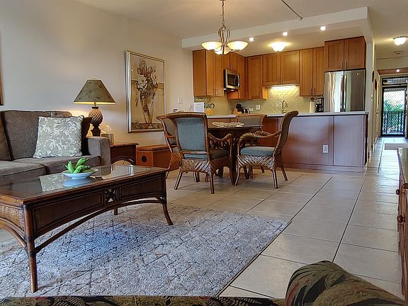 This is a beautifully remodeled, inner-courtyard unit, with the larger lanai and money-saving split system air conditioning units. In the open-plan kitchen you'll find quartz countertops, an elegant arabesque glass tile backsplash, bamboo cabinets and stainless steel appliances. Bathrooms have granite countertops and glass shower/tub surrounds. It comes fully furnished with tropical-themed furniture so you can hit the ground running with your short-term vacation rental. A like new, pull-out sofa means this condo sleeps four. The owners installed a programmable lock to allow for remote control access. Kamaole Sands is located across the street from Kamaole Beach Park III and within walking distance to restaurants and shopping. The complex has a swimming pool, wading pool, and two hot tubs, a fully equipped gym, four tennis courts, parking for your paddle boards and kayaks, and several grilling stations. Poolside concierge can assist with your vacation plans and rent sanitized snorkel gear. Kamaole Sands' onsite vacation rental company can manage your vacation rental unit, or you can choose to go another route.