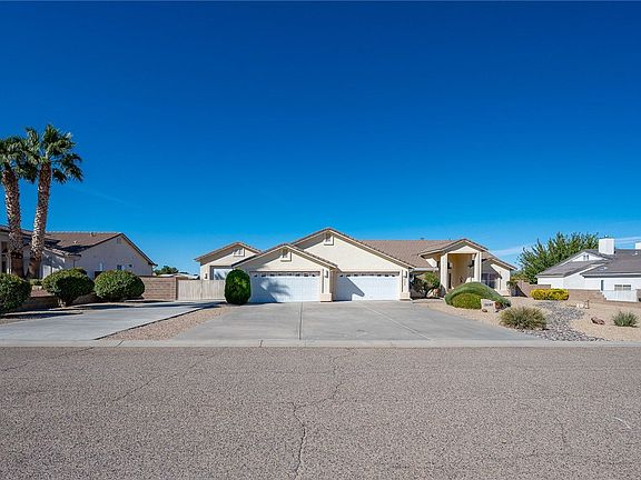 Wow, this incredible property truly has it all! Situated on just under a half-acre, this home offers beautiful mountain views, a sparkling pool with waterfall feature, relaxing spa, and solar heating for those perfect summer days. The large, covered patio includes a gas grill that stays, creating the ultimate space for entertaining. The backyard is enclosed with a block wall for privacy and includes a storage shed. For those needing extra space, there's an attached four-car garage plus a detached garage/shop totaling approximately 5,000 sq. ft. Both garages feature built-in shelving, and the detached garage includes 220 power and an air conditioning unit ideal for car enthusiasts or hobbyists. The exterior has been recently painted with elastomeric paint, and the property includes RV hookups, rain gutters, and extra concrete leading to the detached garage. Inside, you'll find a home that has been meticulously maintained. There's newer carpet in the bedrooms and tile flooring throughout the main living areas. Elegant white plantation shutters, a central vacuum system, and a cozy gas fireplace with mantel add comfort and charm. The kitchen is a showstopper with granite countertops, abundant cabinetry some with pull-out drawers stainless steel appliances including the refrigerator, and a movable island for extra workspace. A formal dining area currently used as a bar room features a solid wood built-in bar. The primary suite is spacious and includes a walk-in closet and ensuite with dual vanities, a jetted tub, and a walk-in shower. The split-bedroom layout offers additional privacy, and the utility room provides extra cabinetry, hanging space, and the washer and dryer are included. This well-maintained home is filled with thoughtful upgrades throughout an exceptional opportunity that combines comfort, functionality, and style.