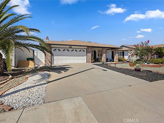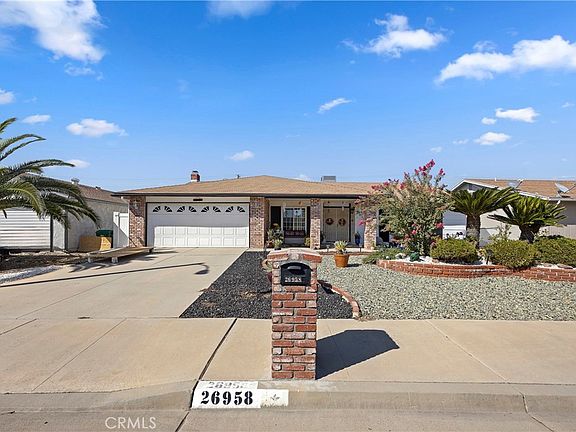 Imagine your home with several different places to relax and or entertain. If this appeals to you then this home is the one. There is a large living room with hardwood floors, brick walled family room with wood burning fireplace, bonus sun room which is environmentally controlled, covered and uncovered patios with outdoor lighting. This home is a spacious, warm and comfortable Single Family Residence in an active adult 55+ community with no rear neighbors. Single story home nestled conveniently between retail areas on McCall, Newport and Ethanac Roads. minutes to the 215. The front and back yards are tastefully landscaped with drought resistant and low maintenance features and shrubs. A Large covered front patio has a double front door which leads to the open living and dining rooms. Kitchen opens to a family room and has upgraded cabinets, sky light and newer stainless steel appliances. The fireplaced family room has beautiful brick walled hearth and wood mantle. Master Bedroom opens to the hall-way as well as the bonus room, and is complete with its own bath, 2 closets, and separate vanity/dressing area. Ceiling fans are in most of the rooms; Flooring is wood or tile - no carpet in the home, crown molding, master bedroom flooring installed in 2023, newer air conditioner unit installed with in last 2 years. Newer replacement windows, double pane. The pride and joy of this home is the amazing back yard which has covered and uncovered patio spaces to relax or entertain on. Property is well lit to spend time out in the evening. A large newer shed is well placed on cement footing in the back yard, it has several entry areas to make access easy. Surrounding the back property is low maintenance white vinyl fencing and a brick wall along the back. Sides are gated off at the back and front with a cement walk-way down the garage side for easier access to and from garage. Oversized 2 car garage in a quiet well kept neighborhood. Mail box is in front of property and built into a brick base that matches the home. This home has multiple living spaces inside as well as outside. Looking for a comfortable versatile home to live and entertain in, this is the one. Additionally, you can enjoy all the amenities the Sun City Civic Association offers its residents. This home is priced below highest value. Welcome Home!!
