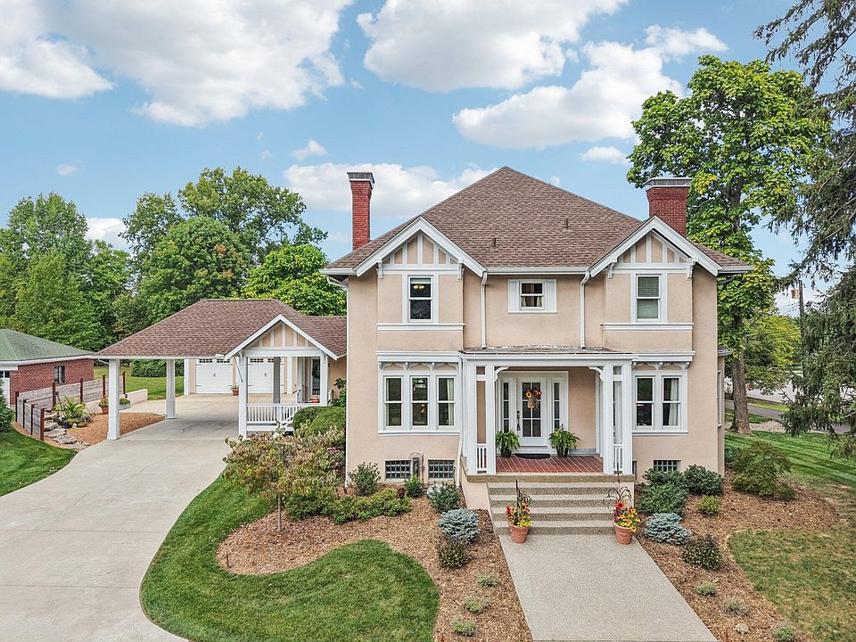 Elegance and timeless character define this remarkable Lakeside Park home, a true piece of Northern Kentucky history. Situated on over an acre, this estate offers unmatched beauty and convenience just minutes to downtown, the airport, and shopping. Restored to excellence, it features hardwood floors, the original banister with wide steps, and an addition filled with light, a gas fireplace, and the original hearth. The open chef's kitchen flows into the dining and family rooms and includes a gas cooktop, quartz countertops, detailed cabinetry, farm sink, and beverage fridge in the island. A front office/study with a Rookwood fireplace adds charm. Upstairs, the owner's suite boasts a spa-like bath with soaking tub, walk-in shower, and double vanities, plus a dream custom closet. A spacious laundry room with built-ins, two more bedrooms, and two full baths complete the level. Outside offers a detached two-car garage, carport, and lush grounds—an exquisite blend of historic charm and modern luxury.
