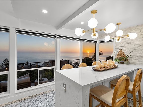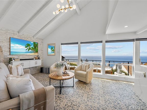 SPECTACULAR LAGUNA BEACH 180 DEGREE OCEAN VIEW CLEAR TO CATALINA ISLAND & just a short walk to Victoria Beach & the famed Pirate Tower. BEAUTIFULLY REMODELED w/ coastal views from EVERY room & from every level of this home!!! Recently renovated residence boasts modern enhancements & a color scheme that harmonizes w/ the coastal ambiance. The home's remarkable curb appeal is immediately evident, characterized by a paver-laid driveway that winds around the lower-level lounge area, vibrant landscaping, refined smooth stucco finishes, & ornate flooring tiles leading to the main level. The expansive wrap-around trex decking, recently upgraded & adorned with new wrought iron railing, offers unparalleled 180-degree ocean views from various vantage points, oceanfront seating, & a lounge space w/ southeast-facing vistas. Stepping through the dutch door, oversized picture windows greet you w/ sweeping views of the Pacific Ocean. The main level features a meticulously designed living room boasting custom flooring, a striking stacked stone accent wall w/ floating built-in storage. The focal point of the interior is the impeccably renovated custom kitchen, featuring quartz countertops, peninsula seating illuminated by modern globe pendant lighting, white shaker cabinets with gold hardware, stainless steel appliances including a brand new a custom built-in glass front fridge & custom built in drawer microwave, recessed lighting, a farmhouse sink w/ a gold gooseneck faucet, stack stone backsplash, & ample storage. Ascending to the upper level is the primary suite, complete w/ custom built-in storage, bedside pendant lighting, recessed lighting, & a fully renovated en-suite bathroom featuring a quartz-topped vanity, modern fixtures, scallop backsplash, recessed lighting, & a vanity mirror w/ built-in illumination. The lower level encompasses the 2nd bedroom, complemented by a compact kitchenette area, a full bathroom, & the home's laundry facilities w/ a stacked washer & dryer. Just installed in 2024, an outdoor custom office pod (not included in SQFT) complete w/ Sound Proofing & bifold doors along w/ AC/Heater and wifi connectivity, perfect for multiple uses, an office, creative work space, or lounge. Recent 2024 upgrades include Central A/C, 200 amp electric panel upgrade, 220v for electric car charging, tankless water heater, rain gutters, whole house water filtration & conditioner, auto window blinds, outdoor lighting, & smart features. Parking (1 driveway/2 street)
