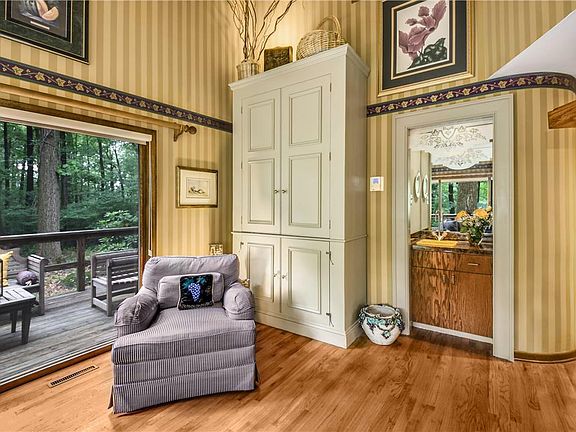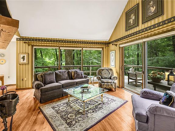 Nature abounds in this stylish country home set amongst tall trees on a quiet road in Lower Saucon township. Situated on a large 4 acre lot, Treetops is a rural retreat that’s a pleasure to come home to. The loft-style floor plan encompasses over 1,500 sqft of living space in an open layout. A stone chimney is the heart of the home, running vertically through the living spaces & providing multiple fireplaces. The eat-in kitchen offers lots of prep & storage space, along w/granite countertops, stainless appliances & a wall of windows. The eating area & airy living room with 2-story vaulted ceiling are nearby. A 1st floor bedroom is a welcome amenity. Upstairs, the lofted primary suite looks out over the living room & features a light-filled bathroom & large walk-in closet. The lower level includes finished living space with a fireplace. Outside, 2 levels of wraparound decks overlook the abundant flora & fauna, with captivating birdsong the soundtrack in every season.