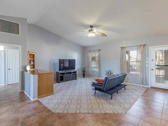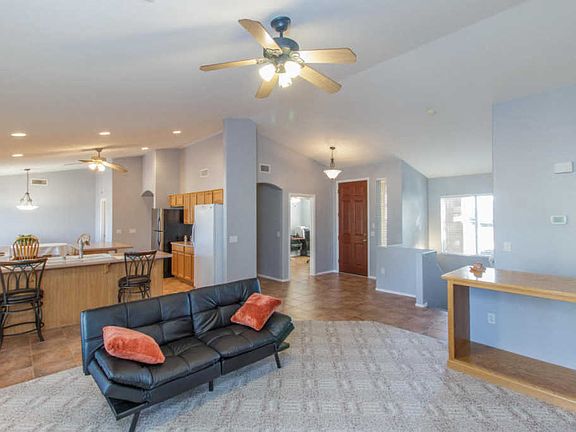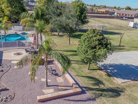 HUGE FAMILY HOME on a fenced acre homesite featuring 6 bedrooms + den & 3.5 baths in 3234 w/finished basement. Main level living room has vaulted ceilings & leads into a large eat-in kitchen w/oak cabinetry, white appliances, island, two breakfast bars, & walk-in pantry. The master suite is on the main level and features 2 bedrooms; perfect for nursery, home office, workout room, etc! The master bath has dual sink vanity, oversized shower, soaking tub & walk-in closet. Two additional bedrooms are on the main level & share Jack & Jill bath w/dual sink vanity. Lower level has additional living/game room w/wet bar, 2 bedrooms & full bath w/dual sinks. The backyard offers a fenced pool & spa, 1/2 court basketball court, multiple sitting areas, Kiva fireplace, firepit, built-in BBQ, RV gates*