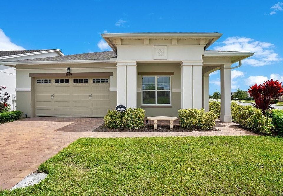 Motivated Seller! This beautifully appointed "Marco" 3-bedroom, 3-bathroom Jones Home offers the perfect blend of livable comfort, charm and sophistication. Located on a corner lot with tranquil water views in the premier 55+ gated community of Twin Lakes in Central Florida, this is the rare opportunity you have been waiting for. Curb Appeal & Backyard Views - Step onto the spacious front porch and soak in the Florida sunshine while enjoying the warm sense of community that Twin Lakes is known for. Triple sliding doors effortlessly open and tuck away where you'll discover your own piece of paradise in the expansive screened lanai primed for a summer kitchen, creates a seamless transition between your indoor retreat and private outdoor oasis designed for year-round enjoyment. Unwind as the vibrant hues of the Florida sky paint a spectacular backdrop each evening over the water. Gourmet Kitchen, Open Living, Seamless Flow - The heart of the home shines with flexibility of the living and dining area with soaring 10’ ceilings, 8’ doors, and a thoughtfully designed 3-way split floor plan which immediately creates an inviting sense of openness. The chef-inspired kitchen is perfect featuring a magnificent granite island complemented by 42” cabinetry with crown molding and Whirlpool appliances. Experience the culinary delights of a natural gas cooktop with a powerful range hood that vents to outdoors. The convenience of the butler's pantry will cater to your lifestyle offering generous storage for all your culinary and entertaining needs. Private retreats for owners and guests - This home features two private ensuites with floor to ceiling shower tiles in all bathrooms. The primary suite is a true sanctuary with tray ceilings, space for a cozy sitting area, and a generous walk-in closet. The spa-like primary bathroom includes a sleek glass-enclosed shower with dual shower heads for a customizable bathing experience. The flex bonus room offers endless possibilities as a home office, media lounge, yoga studio, or private retreat. Resort-style living at Twin Lakes - Life at Twin Lakes is a vibrant, resort-style experience centered around the Lakefront Clubhouse & Amenity Center. A full-time Lifestyle Director ensures a dynamic social calendar with various clubs and activities, from cards and billiards to multiple community events. Stay active with a multitude of amenities including: Clay tennis courts, pickleball, and bocce ball; putting green; lap and resort-style zero-entry pools, a hot tub; state-of-the-art fitness center with sauna and engaging fit classes. For outdoor enjoyment, gather at the grill pavilion and enjoy a fire on a cool day OR explore Live Oak Lake by pontoon, John boat, or kayak that you can rent for the day. The private 31-acre lake is perfect for fishing and bird-watching with opportunities to see bald eagles soaring above. Location and lifestyle - Nestled in St. Cloud, this home offers the best of both worlds: peaceful lakeside living with convenient access to modern amenities. Historic Downtown St. Cloud, dining, and world-class bass fishing on Lake Toho are nearby. Quick access to Lake Nona/Medical City, Orlando International Airport, and the Florida Turnpike puts all of Central Florida within easy reach. Experience the Florida lifestyle you've always dreamed of. Comfort, elegance, and an active community await you at Twin Lakes. Your Florida dream home is here, make your private showing appointment now! Furnished!
