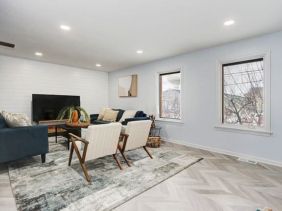 Two outside decksStainless steel appliancesBeautiful white shaker cabinetsQuartz countertopsGrand open kitchen