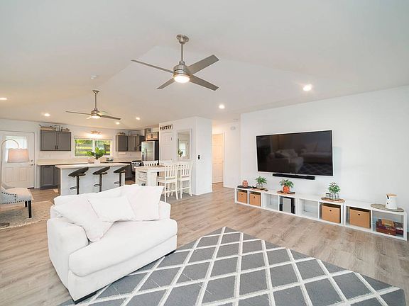 As you step inside, be greeted by the inviting open floor plan and vaulted ceilings that create a sense of space and airiness. The heart of the home, the kitchen, boasts exquisite quartz countertops and a generous island, perfect for entertaining and culinary adventures. The main living area and kitchen feature durable vinyl plank flooring, adding a touch of elegance to the space.