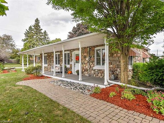 Welcome to this beautiful home that looks like it was pulled from a postcard. Located in a quiet mature neighbourhood, this home is updated throughout yet retains its charming details. Stone exterior, hardwood floors, crown molding and pocket doors are just some of the lovely features you will find in this turn-key home. Enjoy the convenience and ease of bungalow living with everything you need on one level. Entertain in the large open concept living/dining room roughed-in for surround sound. Enjoy the updated eat-in kitchen with lots of storage, counter space and natural light; or relax on the spacious wrap-around front porch. This home is situated on a gorgeous corner lot with mature gardens, interlocking front drive, walkway and back patio, landscape lighting, gas BBQ hookup, heated shed and a serene pond/water feature. Perfectly suited for a first-time buyer or someone looking to downsize, this is the home you have been waiting for.